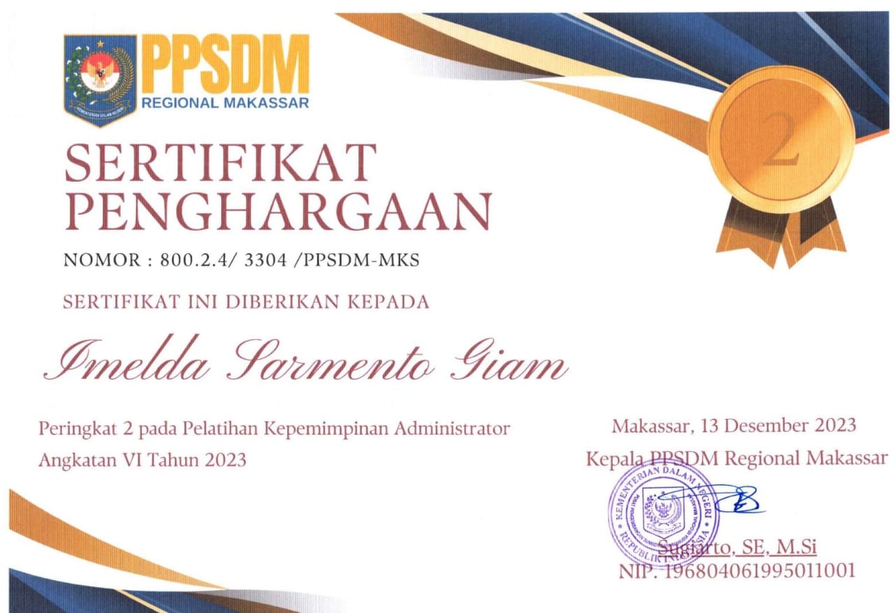Foto : Piagam Penghargaan Peringkat Ke II Yang Di Raih Imelda S Giam (Istimewa)