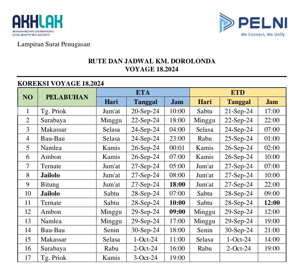 “Yang sesuai Employ KM Dorolonda pada Voyage 18,2024 akan menyinggahi perdana di Pelabuhan Jailolo pada Hari Jumat rencana pukul 08.00 WIT dan akan diberangkatkan menuju Pelabuhan Bitung pada Jam 10.00 WIT,”Sambungnya.