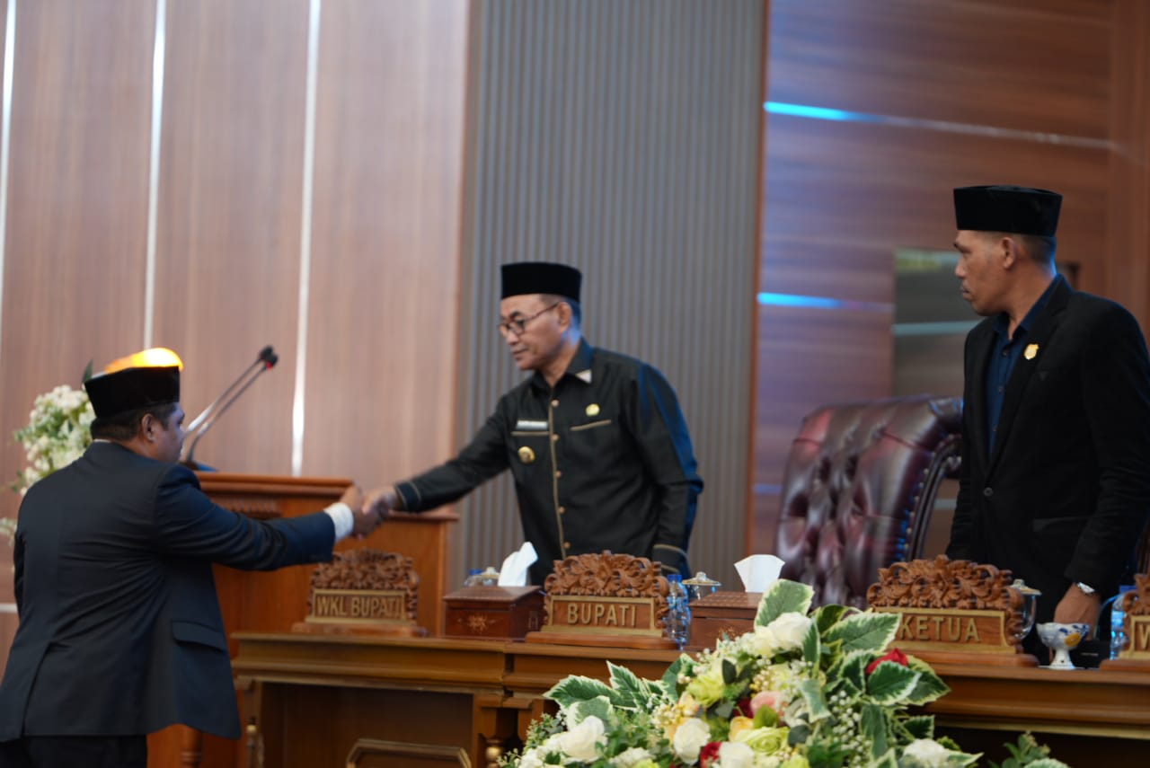 Paripurna tersebut dipimpin oleh Ketua DPRD Ibnu Saud Kadim, didampingi Wakil Ketua II Herman Sidete, dua Fraksi yang menyampaikan pandangan umumnya terhadap RPJMD 2025-2029 yakni Fraksi PDIP dan Gerakan Persatuan Indonesia Raya (Gerindra-Perindo).